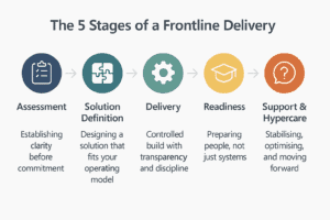 Frontline provides UK‑based delivery, escalation, and support, and we remain engaged well beyond implementation. We focus on long‑term optimisation, not “install and exit” projects, acting as a delivery partner rather than a software reseller.